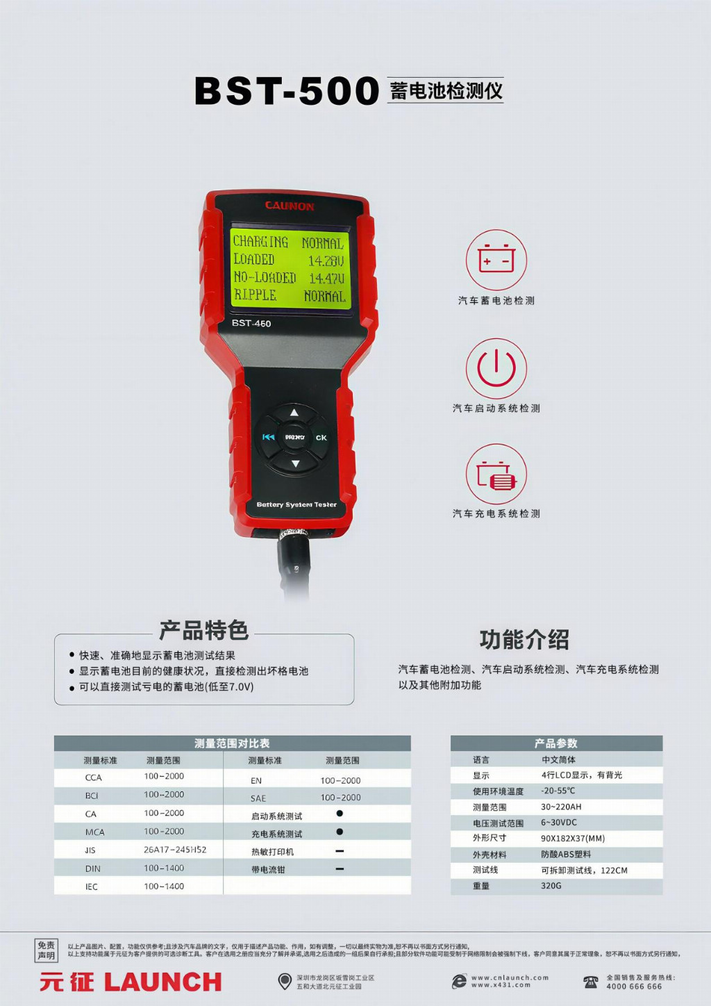 在测量范围上,bst - 500 表现卓越。针对 cca、bci、ca、mca 等多种测量标准,均有 100 - 2000 的覆盖范围,同时也适配 en、sae 等标准,以及 jis、din、iec 等不同地区及特殊规格蓄电池的检测,无论车辆蓄电池遵循何种标准,它都能精准适配、有效检测 。
