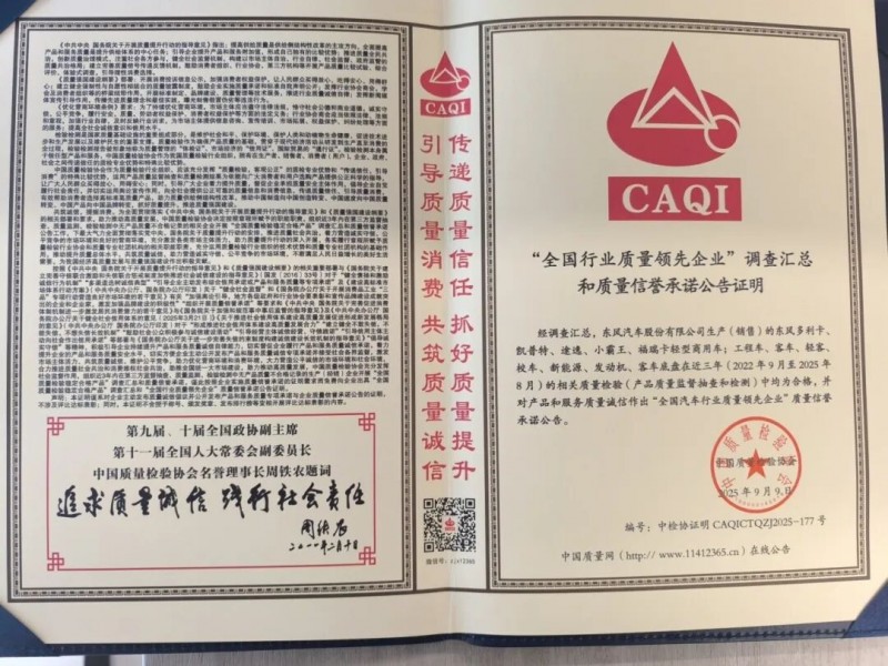 近日,由中国质量检验协会联合全国千家优秀企业发起,旨在推进《质量强国建设纲要》落地,所开展的2025年全国“质量月”企业质量诚信倡议活动公告正式发布!东风股份凭借卓越的产品品质与诚信服务,成功跻身国家主流媒体公告榜单,荣获“全国行业质量领先企业”称号,其质量信誉承诺获权威机构认证。